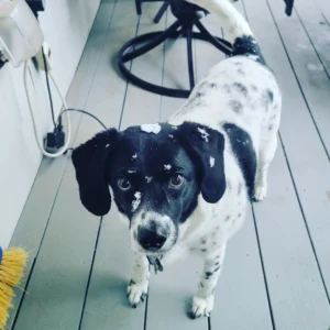 ..emotions are still raw. George was a special boy. Although he was to be the one rescued it ended up being a mutual rescue. See we had just lost our 2 dogs within a month of each other, and we were pretty depressed. George was a really happy dog. And that happiness was contagious. During the fire evacuation in 20 he fell a few times off the ramp getting into the truck and tire his ACL. It was repaired but he developed Larangeal paralysis. We knew it was difficult for him to get around and I know we should have done it sooner but George never complained and all he wanted to do was be by us. Which made it all the harder. When Lisa came that morning George was as alert as always. He laid on the floor with his head in my lap. He went out eating all the chocolate kisses he wanted and slowly drifted off to sleep snoring as he slept and finally crossed over the Rainbow Bridge. It’s never easy but Lisa was very understanding and we never felt rushed. God gives us all special talents but hers calming presence made all the difference that day.The paw print and the bubbles are special treasures we will always have for our remembrance of “George the Dog”. Oliver his little brother even sleeps in George’s d spot..So thank you Dr. Lisa you made all the difference that day with your calming presence.